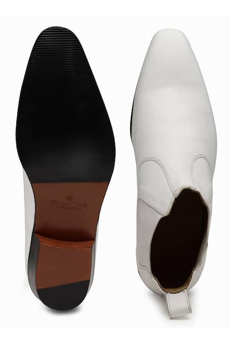 White leather boots featuring an almond toe design and cushioned foot bed