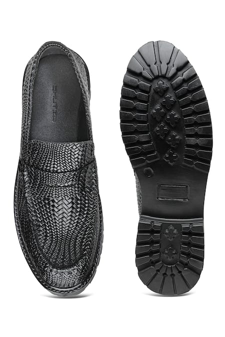 Black leather slip-on shoes featuring a herringbone woven pattern and almond toe