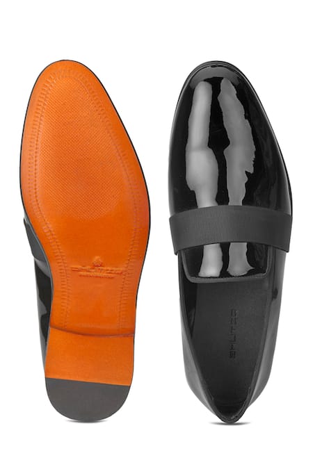 Black cummerbund leather shoes featuring a round toe and cushioned foot bed