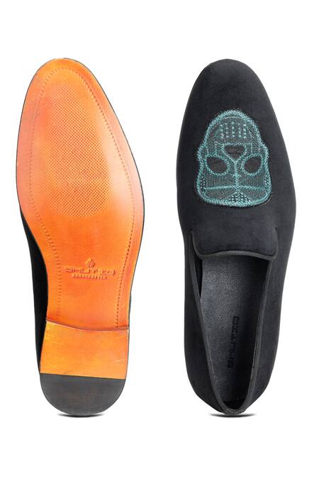 Black velvet slip-on shoes featuring blue skull face embroidery and leather cushioned foot bed