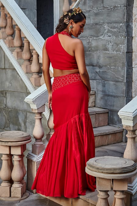 Red Georgette Thread And Cutdana One Shoulder Embroidered Crop Top & Skirt Set