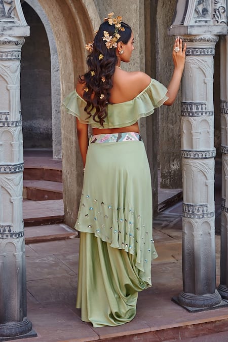Sage green draped skirt with embroidered waistband and asymmetrical layer. Comes with off shoulder crop top.