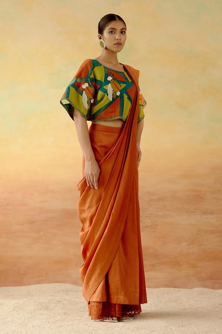 Sandstone pre-stitched saree with cutwork lace hem. Comes with multi colored poncho style blouse.