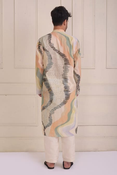 Ivory kurta featuring abstract prints, band collar, and button placket. Paired with straight pants in organic cotton fabric.
