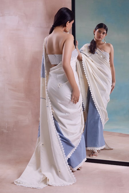 Ivory & blue organic cotton seersucker patchwork saree featuring bloom lace embellishments on the border. Paired with a cross strap off shoulder blouse with mesh & beads detailing.