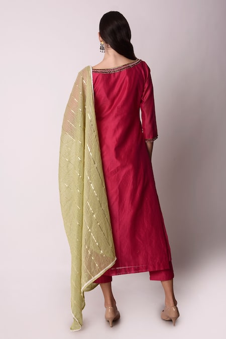 Fuschia straight kurta with bead embroidery on the neckline and sleeve hems. Comes with straight cropped pants and jade dupatta.