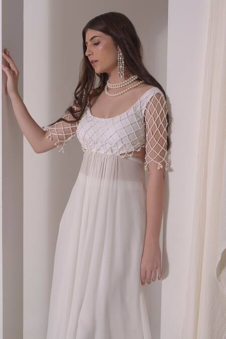 White padded kurta featuring corded jaal elbow sleeves and a deep round neckline. Paired with A-line pant and an abstract foil print dupatta.