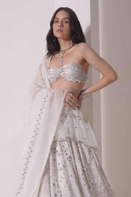 White asymmetric layered lehenga featuring abstract foil print and sequin embellishments. Paired with a strapless ruched padded bustier and a gota wave embroidered dupatta.