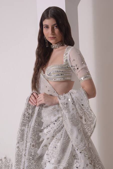 White tiered lehenga featuring a crepe base with attached cancan. Paired with a padded elbow sleeve blouse adorned with tonal sequins and an abstract foil print dupatta.