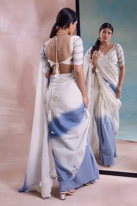 Blue and ivory ombre saree crafted in organic cotton with floral applique embellishments. Paired with a wave neck half sleeves blouse featuring lace embroidery detailing.
