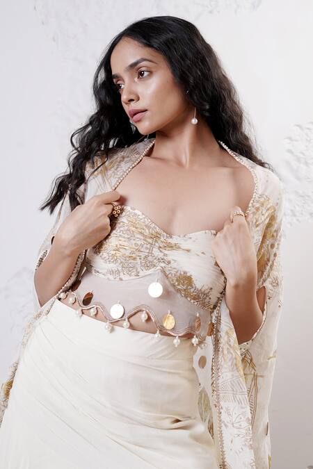 Ivory Organza, Crepe Foil Printing, Beads Sweetheart Cape Layered Lehenga Set