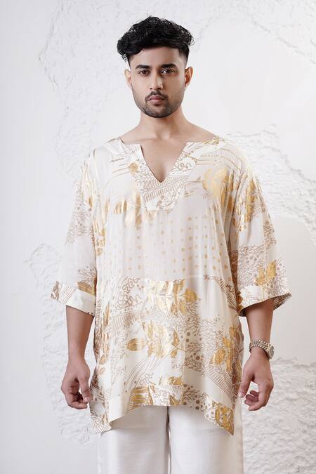 Ivory kaftan kurta featuring a notched neckline and three-quarter sleeves with foil print. Paired with a relaxed pant in viscose linen.