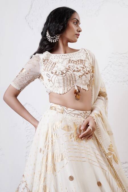 Buy_Shwetanga_Ivory Organza Sequins, Beads, Foil Printing Boat Neck Scarf Lehenga Set