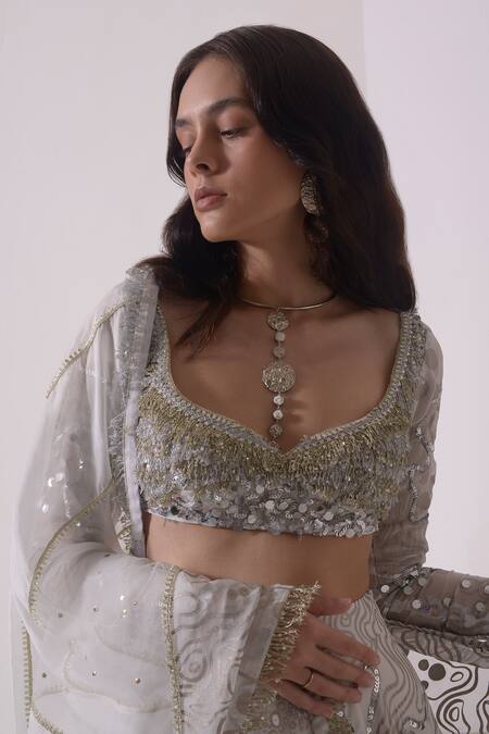 White organza lehenga featuring abstract foil print and sequin embellishments. Paired with a padded blouse with full sleeves and a silver lace striped dupatta.