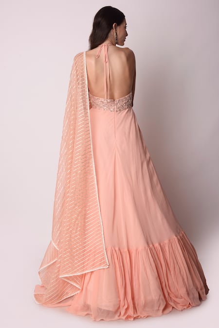 Peach Ggt And Organza Gota Patti, Cutdana & Beads Halter Anarkali With Dupatta