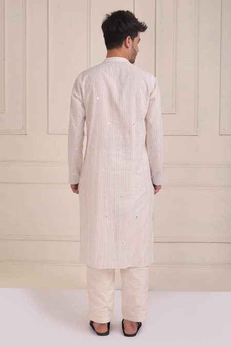 Ivory kurta featuring mirror and kantha stripes embroidery with a band collar and full sleeves. Paired with straight pants for a complete look.
