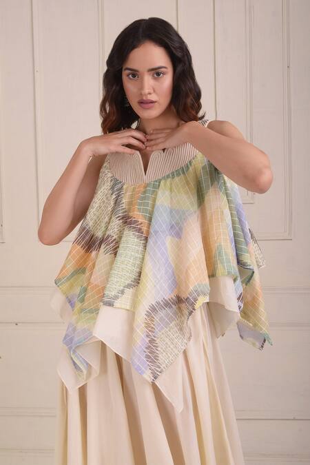 Ivory organic cotton flared top featuring an asymmetric hem and pleated bustier. Paired with a bias-cut sharara with floral lace work at the hem.