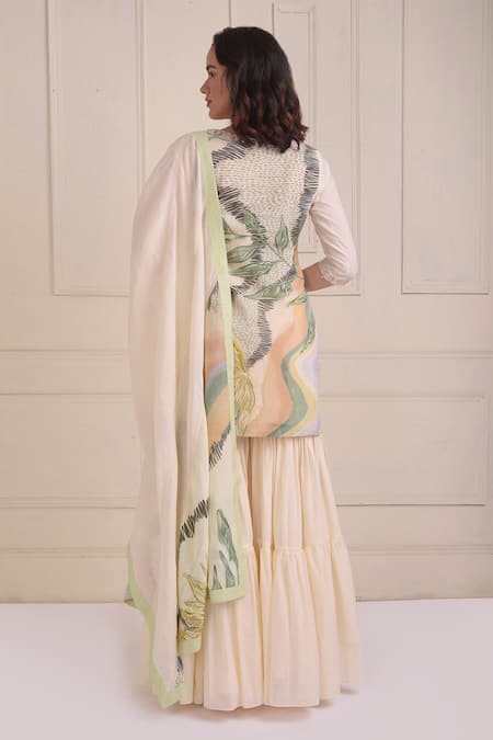 Ivory kurta featuring abstract print panels, cord embroidery, and bead tasselled hem. Paired with a flared tiered sharara and embroidered dupatta with a printed border.
