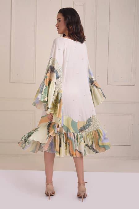 Ivory dress featuring abstract print and pearl work with batwing sleeves