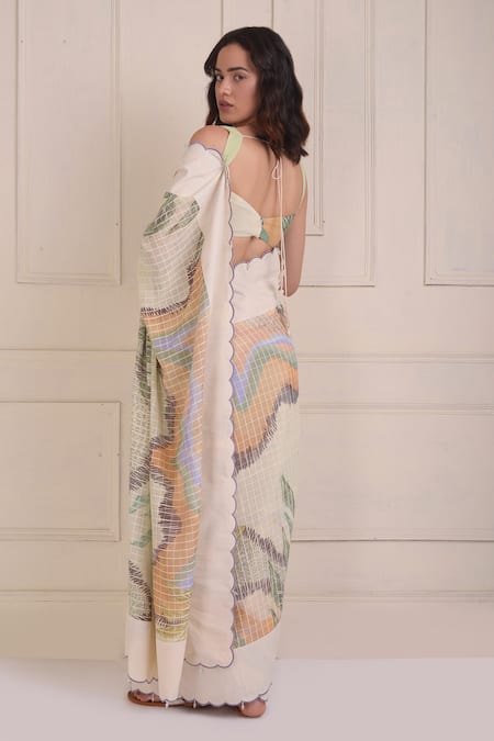 Ivory printed saree featuring an abstract and checkered design. Paired with a draped blouse showcasing a sweetheart neckline and sleeveless style.