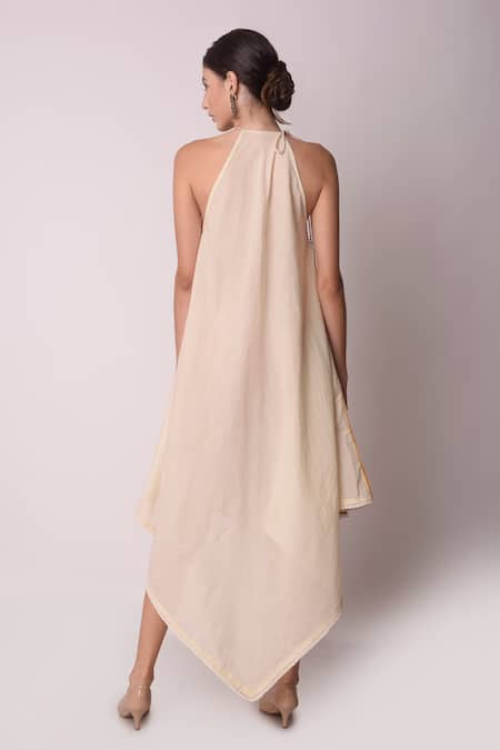 Ivory scarf dress with patchwork, gota patti trims, floral lace detail and tie up at the shoulders.