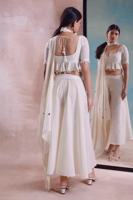 Ivory ruffled peplum top featuring hanging bead details and a sweetheart neckline. Paired with matching flared pant and cotton mesh dupatta with lace border.