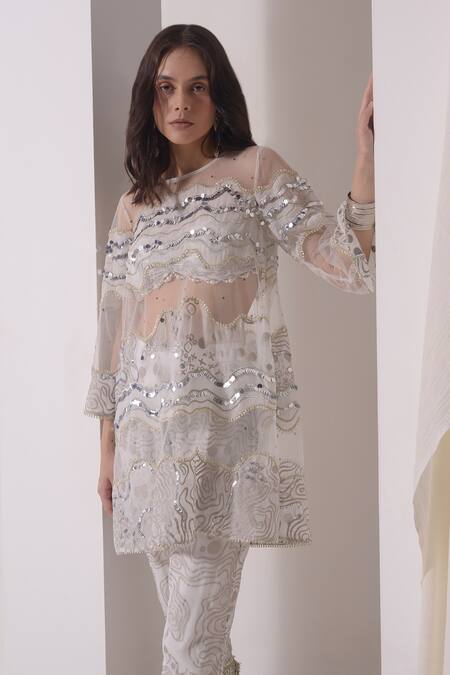 White embellished kurta featuring three fourth flared sleeves and sequin wave patch work embroidery. Paired with abstract foil print cropped pant with thread tassels detailing at the hem.