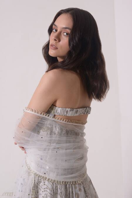 White strapless padded tunic in organza with foil print and tassel embellishments. Paired with a gathered flare sharara and mukaish embroidered net dupatta.