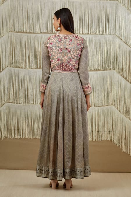 Grey anarkali with applique thread embroidery & floral printed motifs. Paired with pant & printed tassel dupatta.