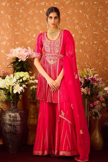 Scarlet red maroon kurta featuring miniature floret buttis and floral zardozi hand embroidery. Paired with a matching sharara and a dupatta adorned with scattered embroidery, along with a coordinating belt.