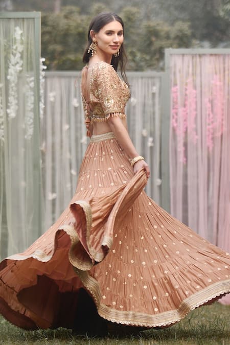 Zardozi embroidery on the blouse, Tassel details on sleeves, Embroidered belt with lehenga