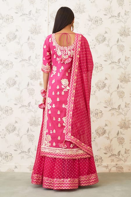 Magenta pink kurta with floral embroidered & brocade motifs. Paired with woven motifs , side tassel tie-up skirt & woven motif dupatta.