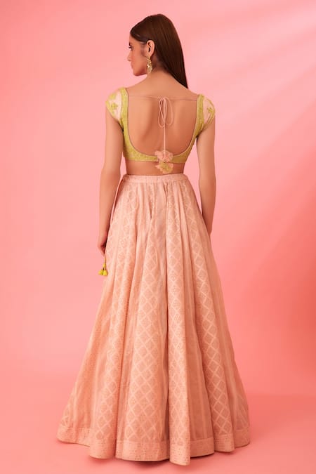 Pink lehenga featuring a geometric pattern with a side tassel tie-up. Paired with a patchwork padded blouse and embroidered dupatta in green.