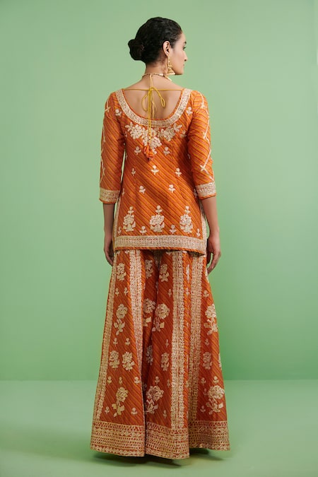 Orange short kurta with gota embroidery & printed detail. Comes with sharara with embroidered net yellow dupatta.