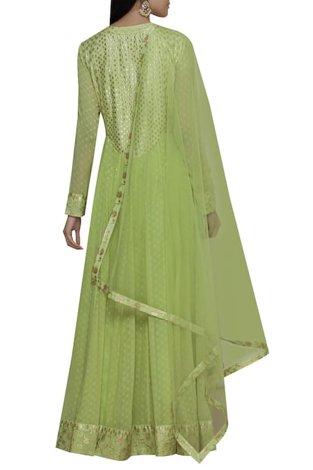 Light green flared anarkali with floral zardozi embroidery on the yoke. Paired with straight pants & georgette dupatta.