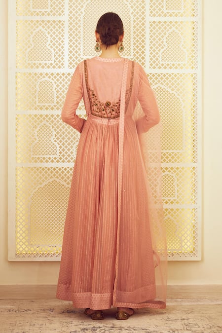 Onion rose pink anarkali highlighted with zardozi embroidery, round neckline, concealed placket and scallop edged hem. Comes with dupatta and tie-up.