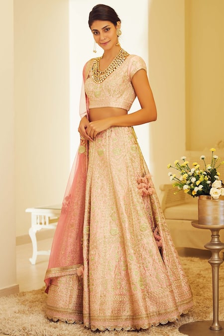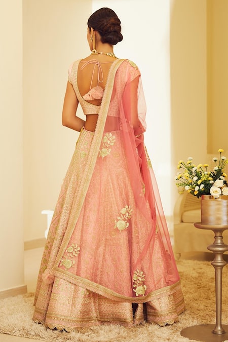 Pink blouse with all over floral jaal work. Comes with lehenga & dupatta.
