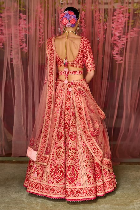 Pink Silk, Net Tassels, Embroidery, Floral And Thread Work Bridal Lehenga Set