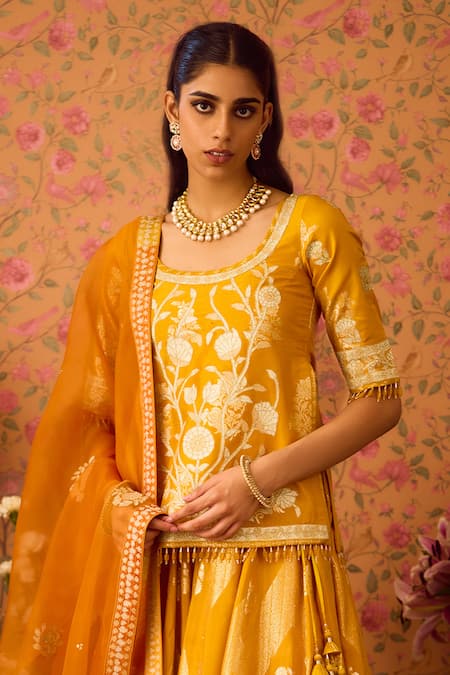Gold yellow mustard tunic featuring floral bloom applique and half sleeves. Paired with a coordinating cancan lehenga and dupatta with brocade border.