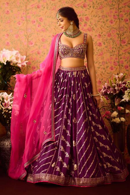 Purple Silk Organza, Viscose Floral Brocade Panelled Bridal Lehenga Set