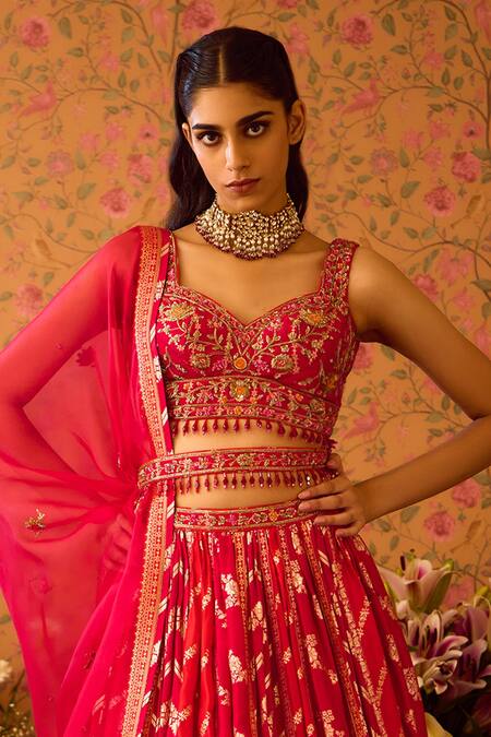 Scarlet red lehenga featuring floral brocade panels and zardozi hand embroidery. Paired with a padded blouse and a dupatta, along with an embroidered belt.