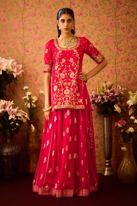 Red Silk Organza, Georgette, Viscose Flower Zardozi Kurta And Lehenga Set