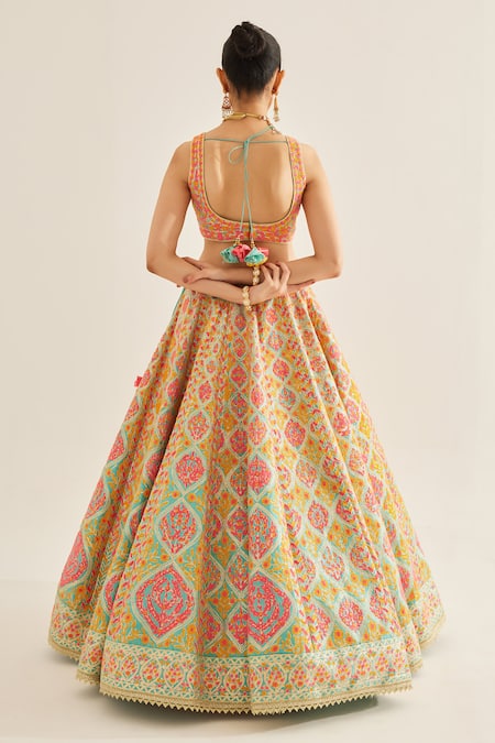 Capri blue lehenga featuring floral ogee pattern with gota and tread work. Paired with a sleeveless padded blouse and embroidered dupatta with tasselled edges.