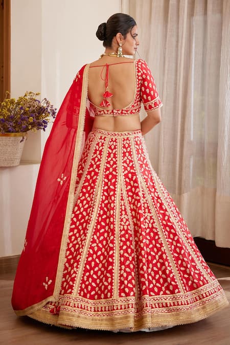 Red Raw Silk And Chiffon Gota & Thread Scoop Neck Embroidered Bridal Lehenga Set