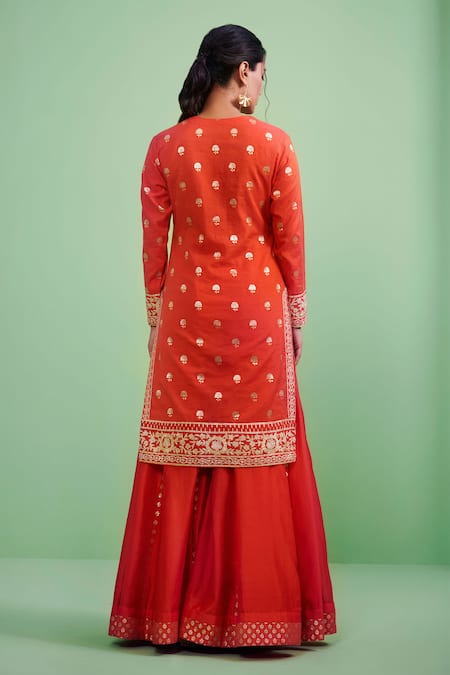Red kurta highlighted with gota embroidered yoke, brocade motifs, round neckline, concealed placket & Straight silhouette. Comes with sharara & organza dupatta.
