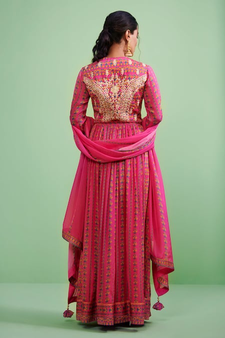 Pink kurta with all-over floral print, gota embroidered yoke, concealed placket & full sleeves. Comes with pant & dupatta.