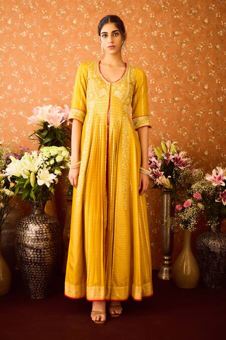 Yellow Silk Organza, Viscose Embroidery, Zari Hand Front Slit Anarkali Pant Set