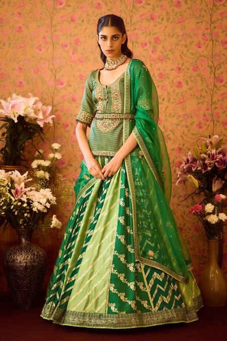 Green Silk Organza, Viscose Embroidery, Zari Jasper Floral Tunic And Lehenga Set