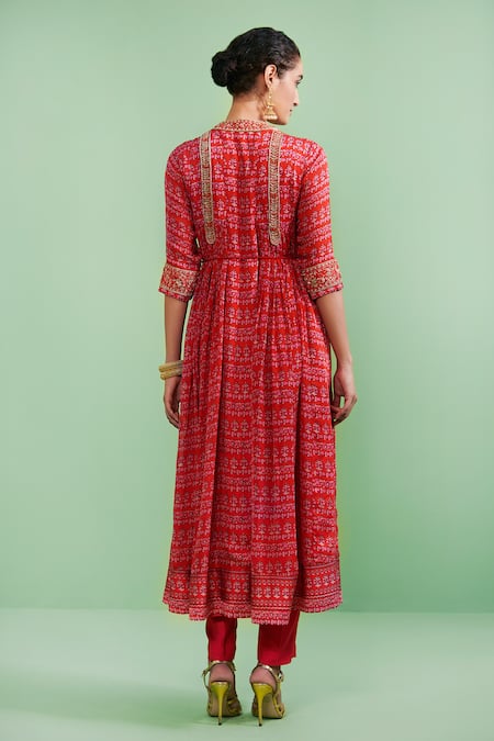 Red anarkali with zardozi embroidered & printed detail. Comes with trousers and printed flat chiffon dupatta.