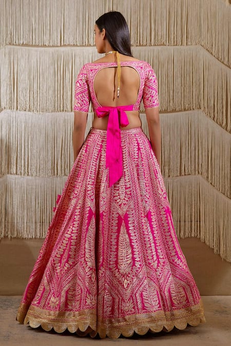 Pink Raw Silk, Net Floral, Gota Work Leaf Neck Embroidered Bridal Lehenga Set